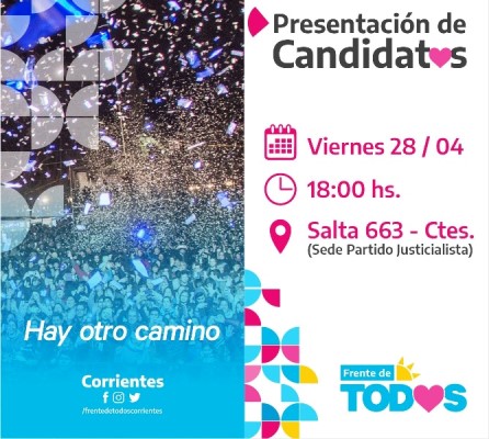 El viernes 28 de abril, el Frente de Todos Corrientes presentará sus candidatos de cara a las elecciones legislativas provinciales del 11 de junio. El evento será a partir de las 18 en la sede del Partido Justicialista, ubicado en calle Salta 663 de la ciudad de Corrientes.