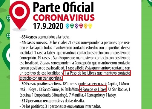 El informe epidemiológico de la Provincia da cuenta que se registraron 45 contagios de Coronavirus en las últimas 24 horas, de los cuales 21 de ellos corresponden a personas que residen en Capital, 1 a Tabay, 19 a San Roque, 2 a Concepción, 1 a Bella Vista, 1 a Paso de los Libres, todos se encuentran aislados y cumpliendo con el protocolo correspondiente....